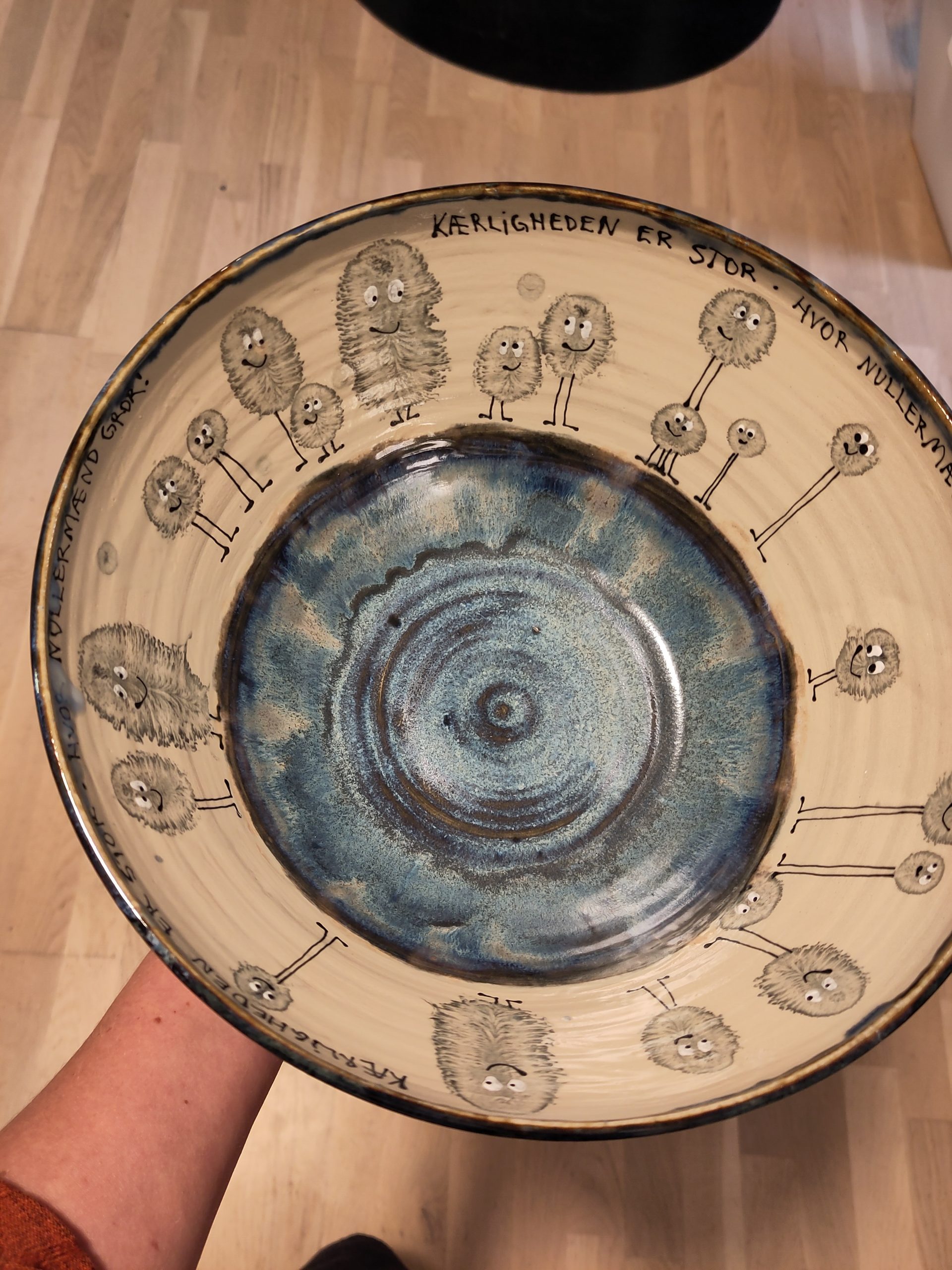 Skålen er fødevareegnet og tåler maskinopvask. Den er lavet af stentøjsler. Den er hånddrejet og hånddekoreret.